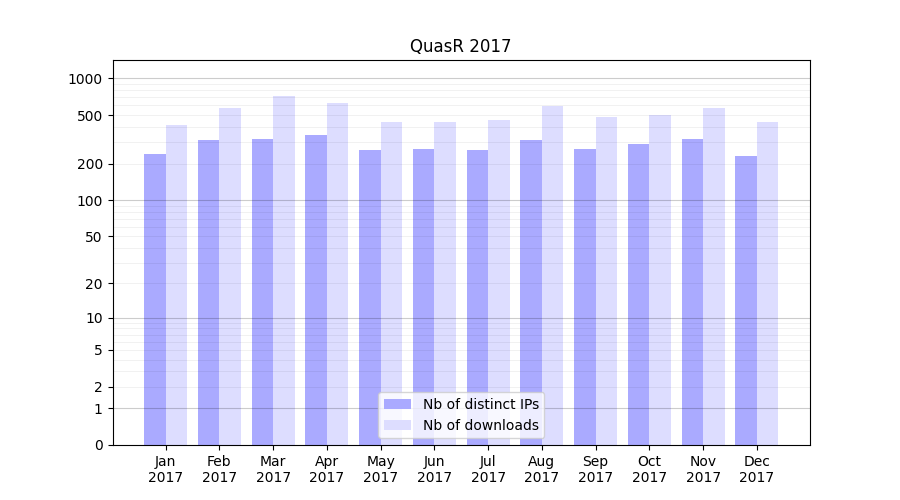 Number of downloads for software package QuasR, year by year, from 2025 back to 2014 (years with no downloads are omitted):