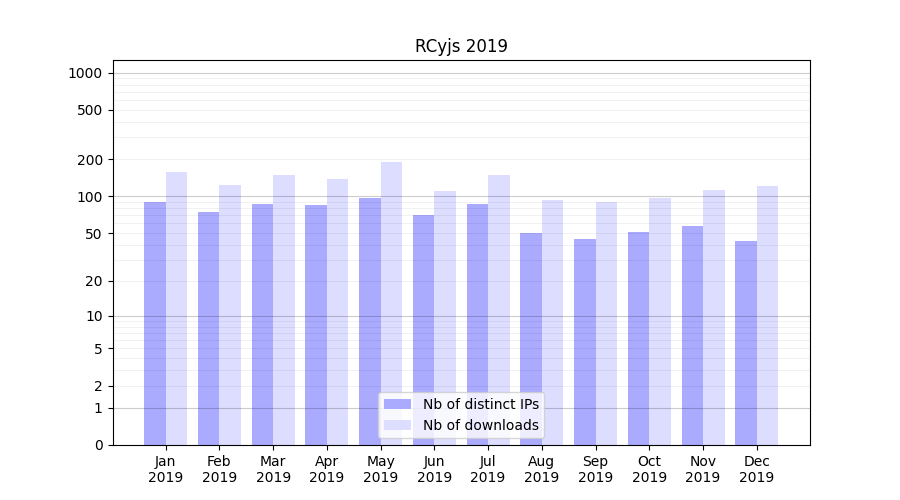 Number of downloads for software package RCyjs, year by year, from 2025 back to 2014 (years with no downloads are omitted):