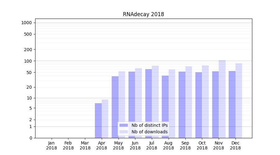Number of downloads for software package RNAdecay, year by year, from 2025 back to 2014 (years with no downloads are omitted):