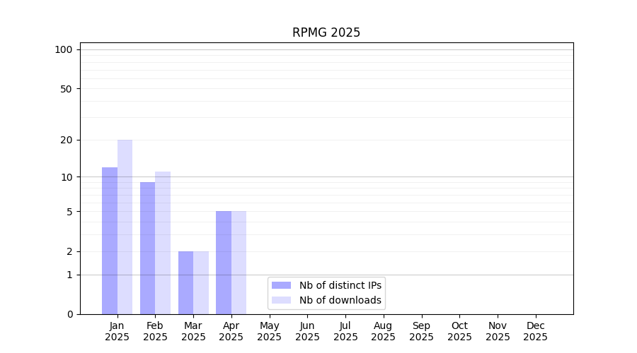 Number of downloads for software package RPMG, year by year, from 2025 back to 2014 (years with no downloads are omitted):