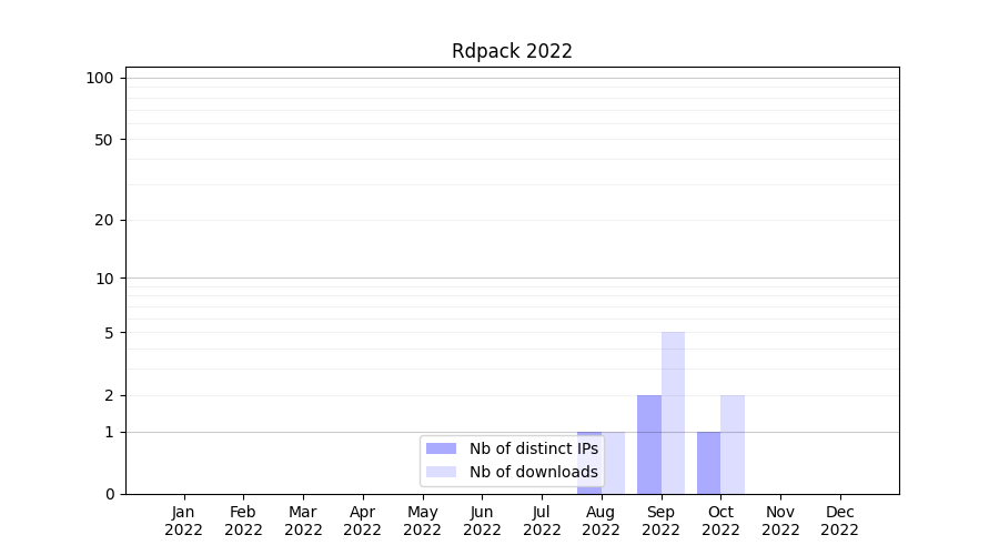 Number of downloads for software package Rdpack, year by year, from 2025 back to 2014 (years with no downloads are omitted):