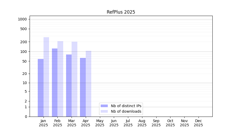 Number of downloads for software package RefPlus, year by year, from 2025 back to 2014 (years with no downloads are omitted):
