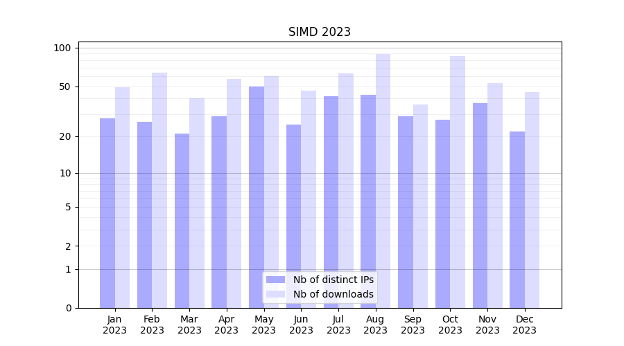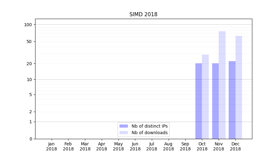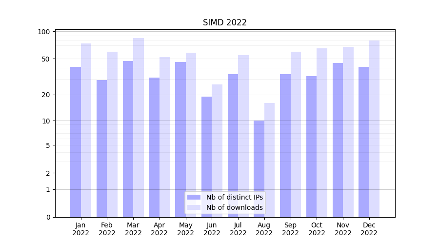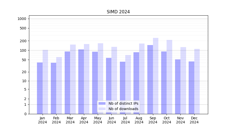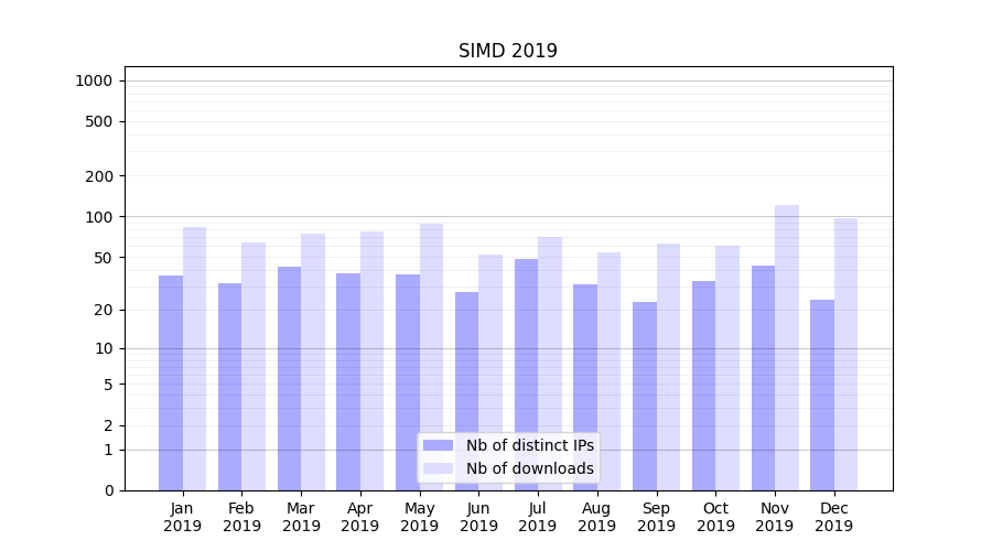 Number of downloads for software package SIMD, year by year, from 2025 back to 2014 (years with no downloads are omitted):