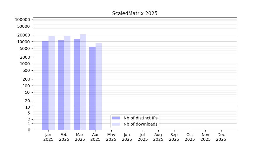 Number of downloads for software package ScaledMatrix, year by year, from 2025 back to 2014 (years with no downloads are omitted):