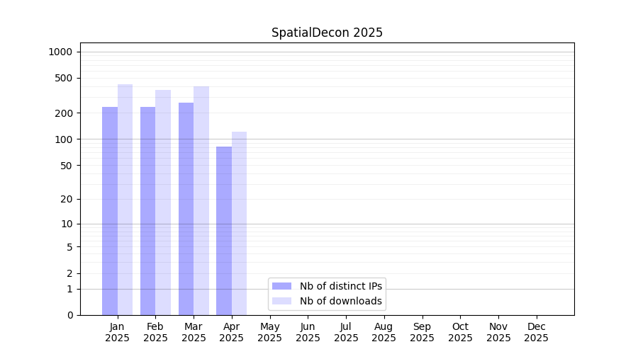 Number of downloads for software package SpatialDecon, year by year, from 2025 back to 2014 (years with no downloads are omitted):