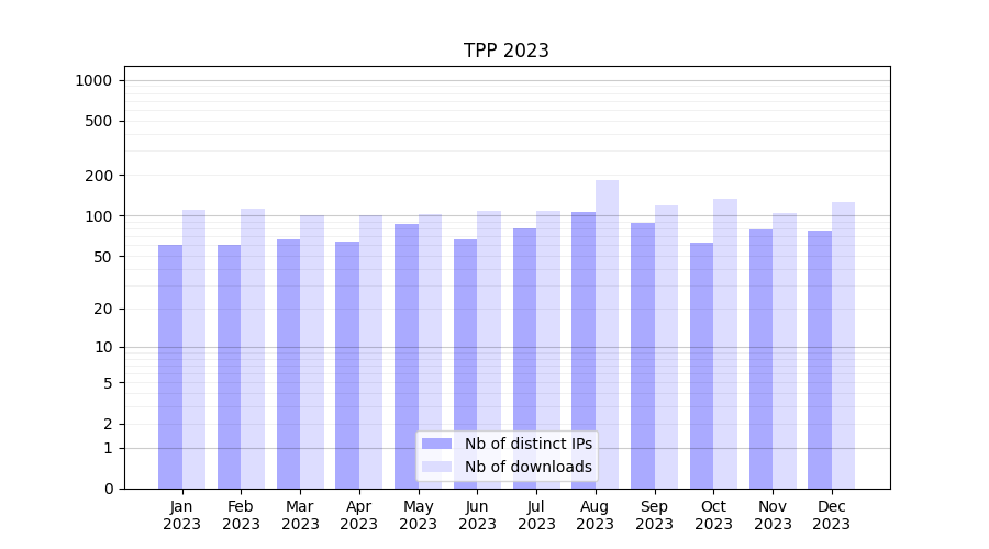 Number of downloads for software package TPP, year by year, from 2025 back to 2014 (years with no downloads are omitted):