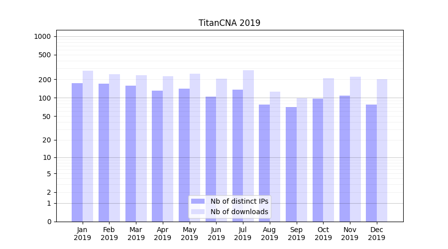 Number of downloads for software package TitanCNA, year by year, from 2025 back to 2014 (years with no downloads are omitted):