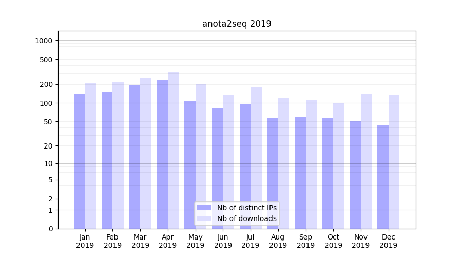 Number of downloads for software package anota2seq, year by year, from 2025 back to 2014 (years with no downloads are omitted):
