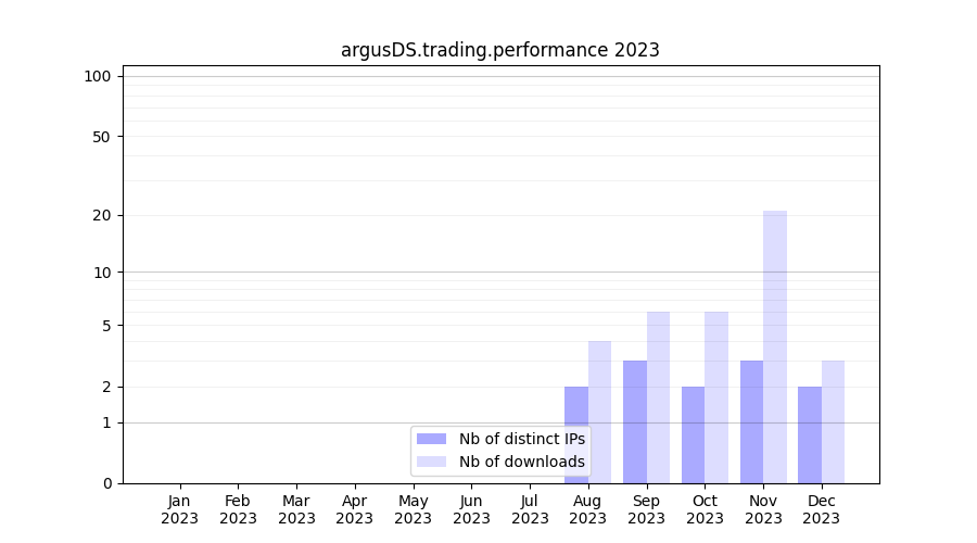 Number of downloads for software package argusDS.trading.performance, year by year, from 2025 back to 2014 (years with no downloads are omitted):