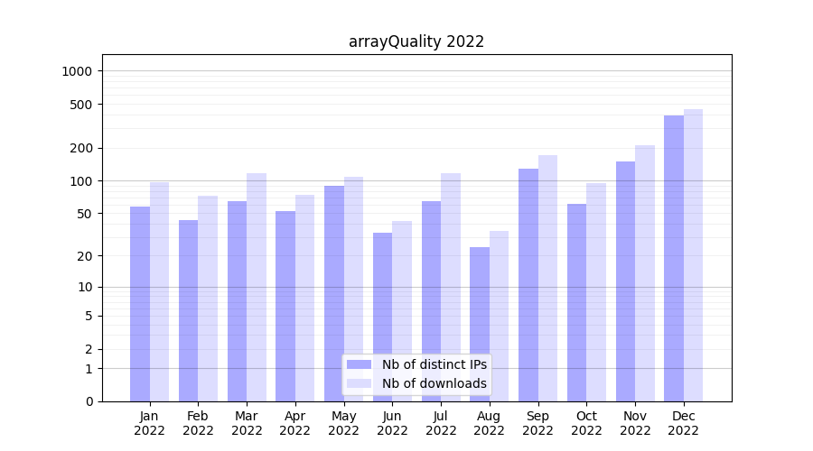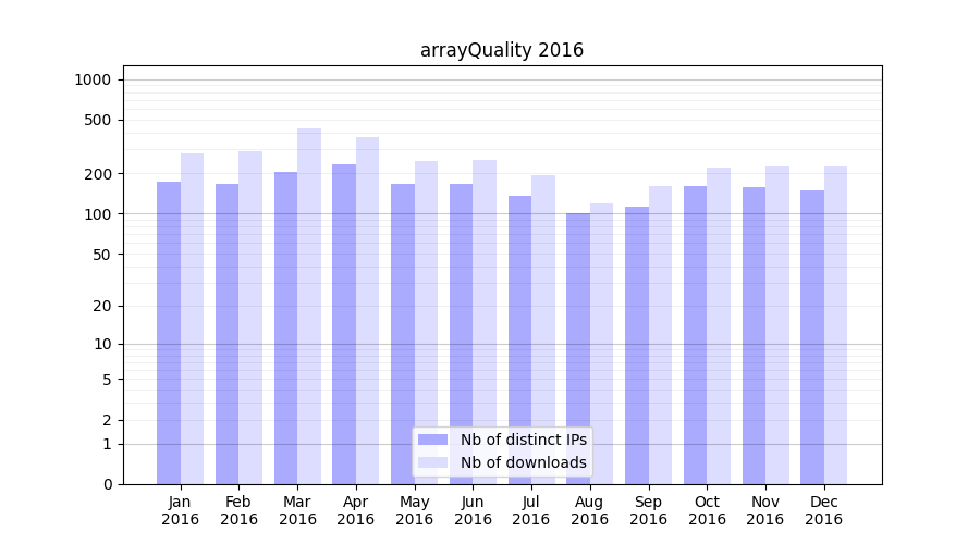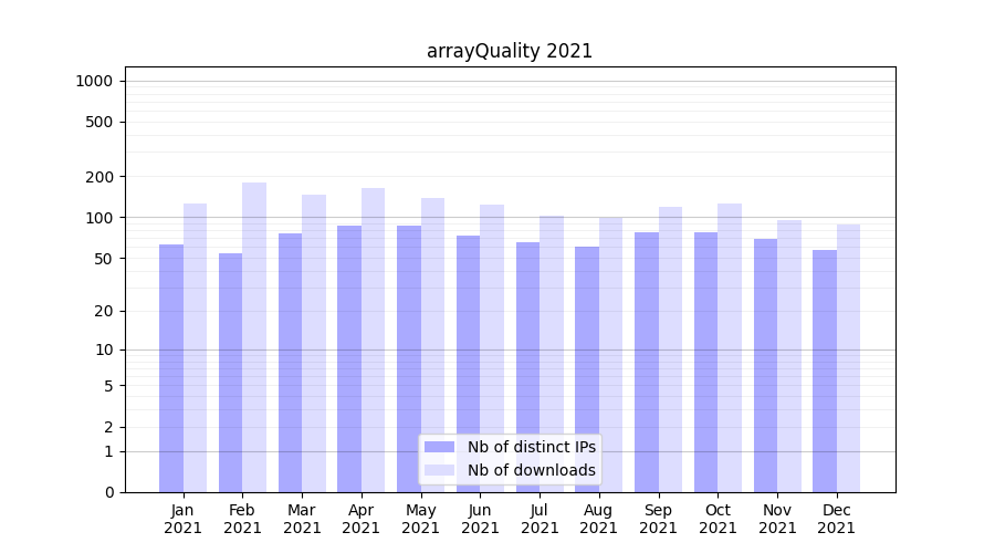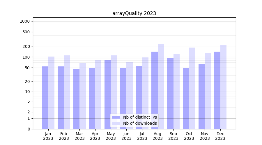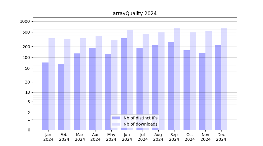 Number of downloads for software package arrayQuality, year by year, from 2025 back to 2014 (years with no downloads are omitted):
