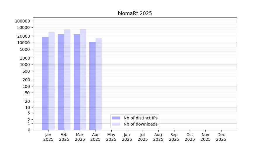 Number of downloads for software package biomaRt, year by year, from 2025 back to 2014 (years with no downloads are omitted):