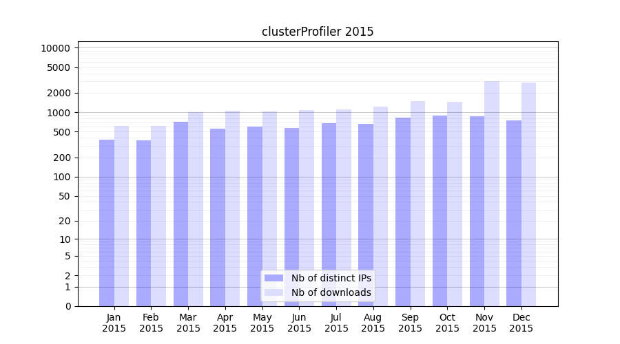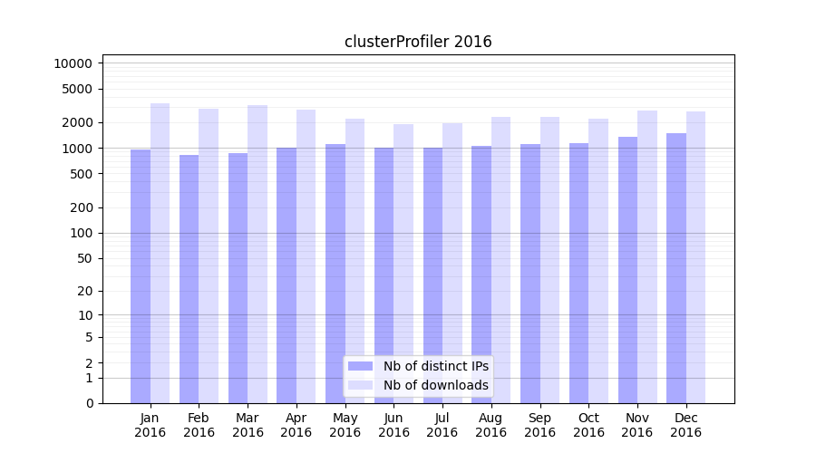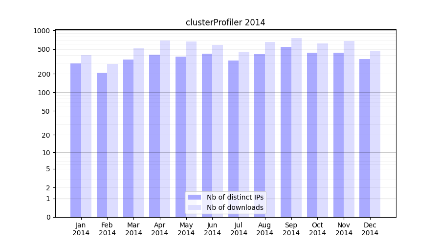 Number of downloads for software package clusterProfiler, year by year, from 2025 back to 2014 (years with no downloads are omitted):