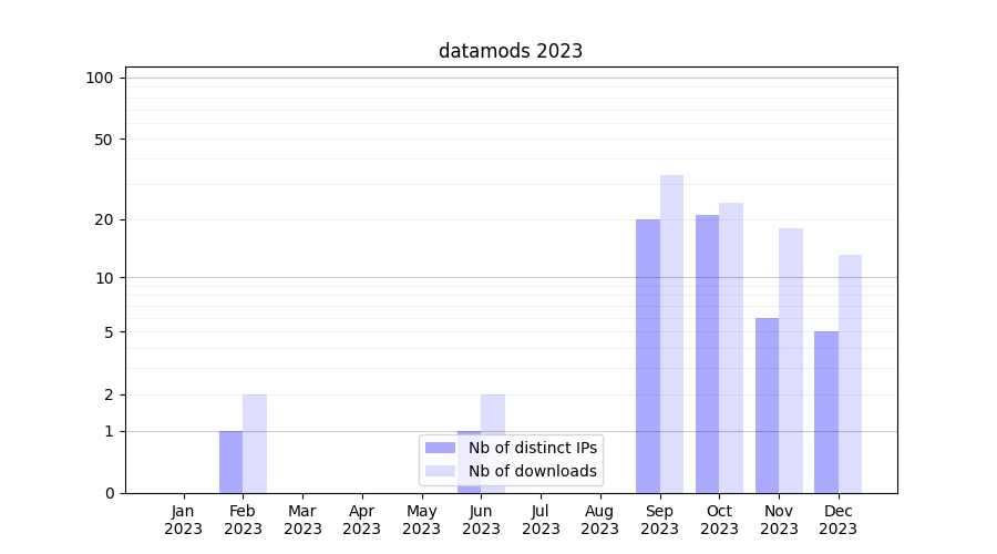 Number of downloads for software package datamods, year by year, from 2025 back to 2014 (years with no downloads are omitted):