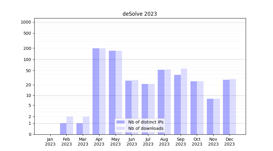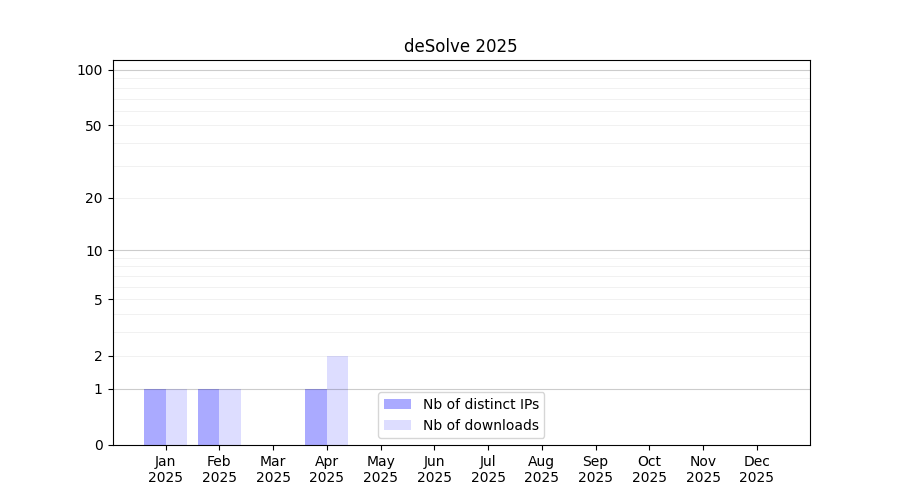 Number of downloads for software package deSolve, year by year, from 2025 back to 2014 (years with no downloads are omitted):