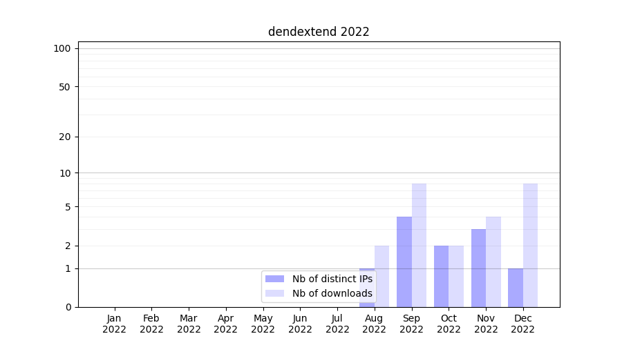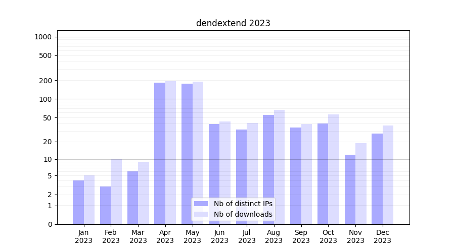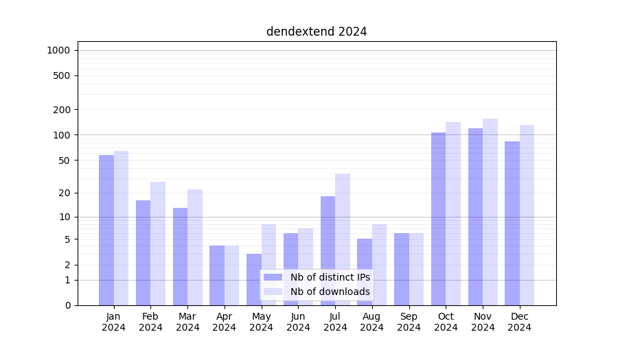Number of downloads for software package dendextend, year by year, from 2025 back to 2014 (years with no downloads are omitted):