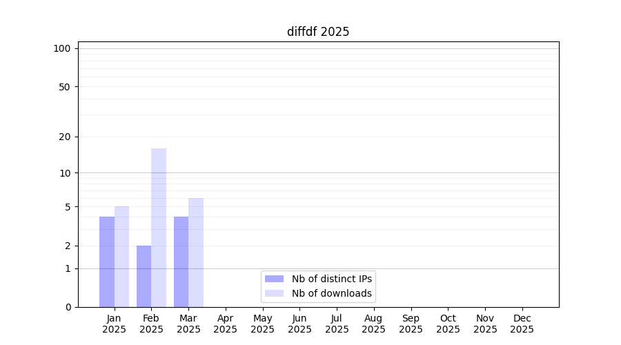 Number of downloads for software package diffdf, year by year, from 2025 back to 2014 (years with no downloads are omitted):