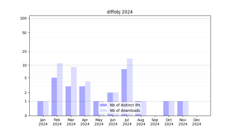 Number of downloads for software package diffobj, year by year, from 2025 back to 2014 (years with no downloads are omitted):
