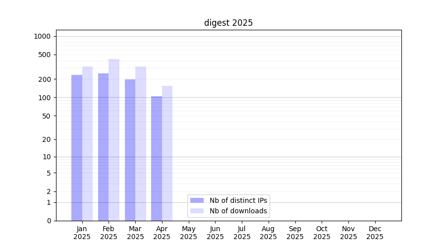 Number of downloads for software package digest, year by year, from 2025 back to 2014 (years with no downloads are omitted):