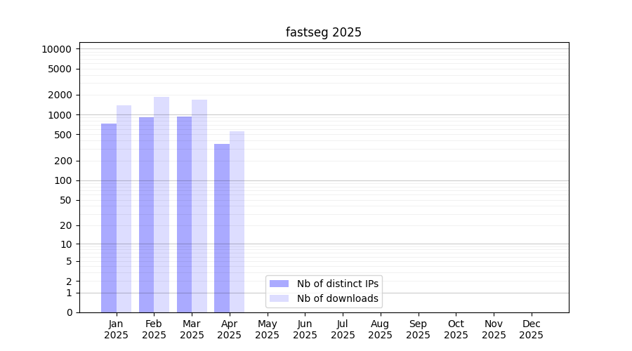Number of downloads for software package fastseg, year by year, from 2025 back to 2014 (years with no downloads are omitted):