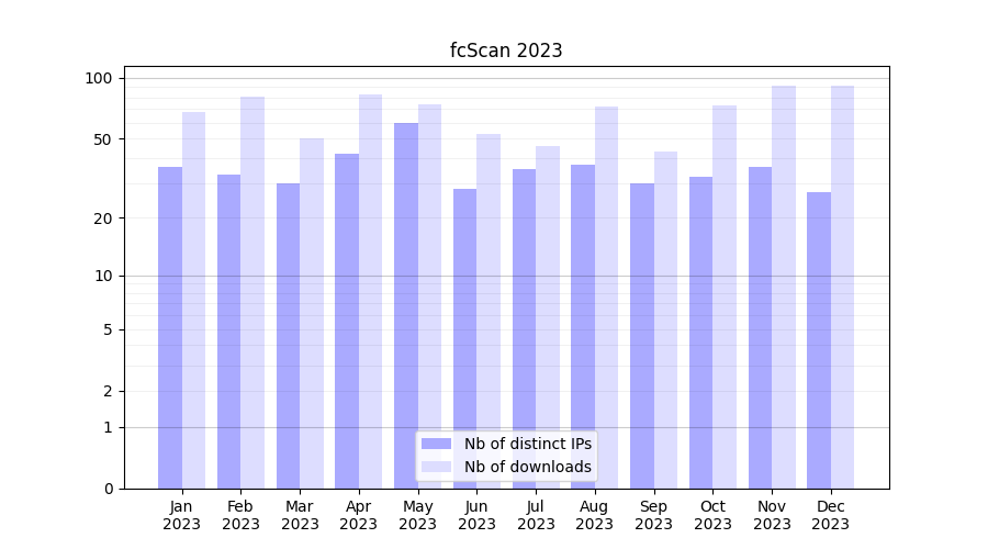 Number of downloads for software package fcScan, year by year, from 2025 back to 2014 (years with no downloads are omitted):