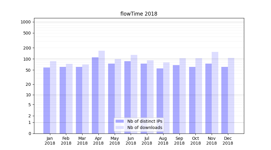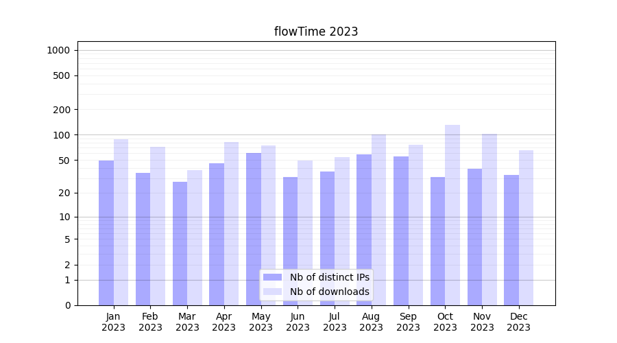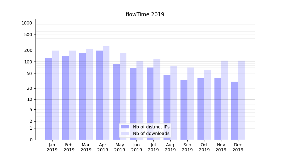 Number of downloads for software package flowTime, year by year, from 2025 back to 2014 (years with no downloads are omitted):