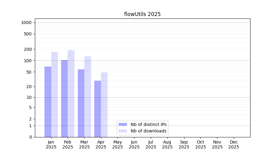 Number of downloads for software package flowUtils, year by year, from 2025 back to 2014 (years with no downloads are omitted):