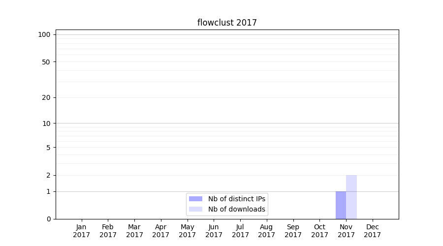 Number of downloads for software package flowclust, year by year, from 2025 back to 2014 (years with no downloads are omitted):