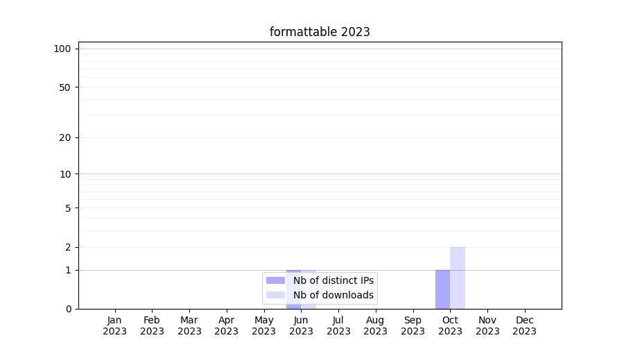 Number of downloads for software package formattable, year by year, from 2025 back to 2014 (years with no downloads are omitted):