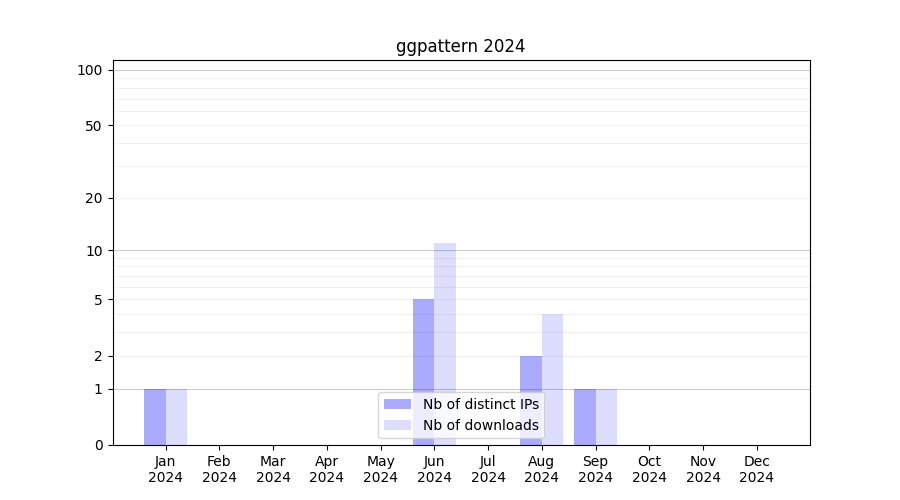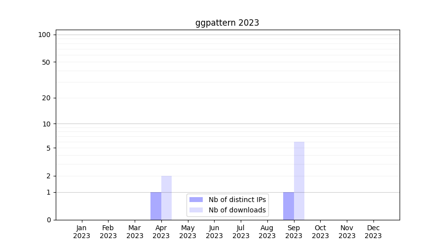 Number of downloads for software package ggpattern, year by year, from 2025 back to 2014 (years with no downloads are omitted):