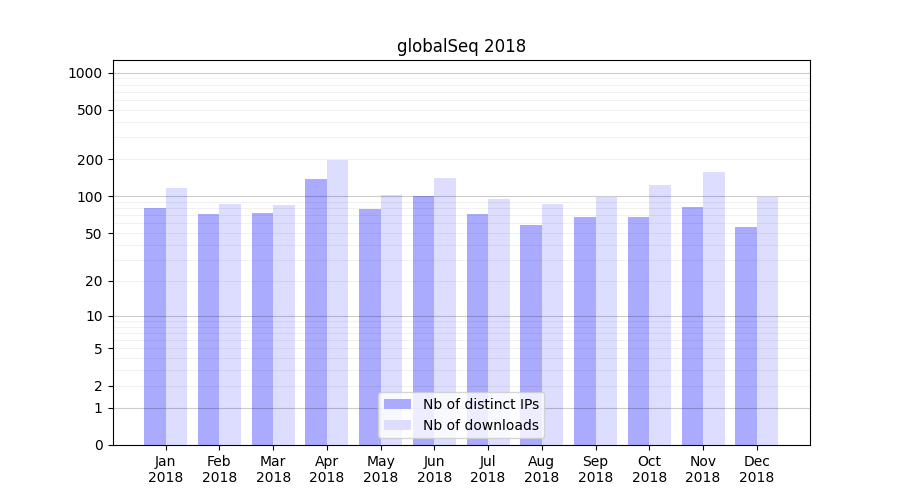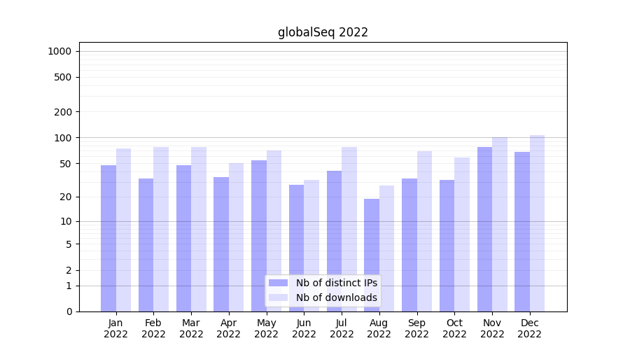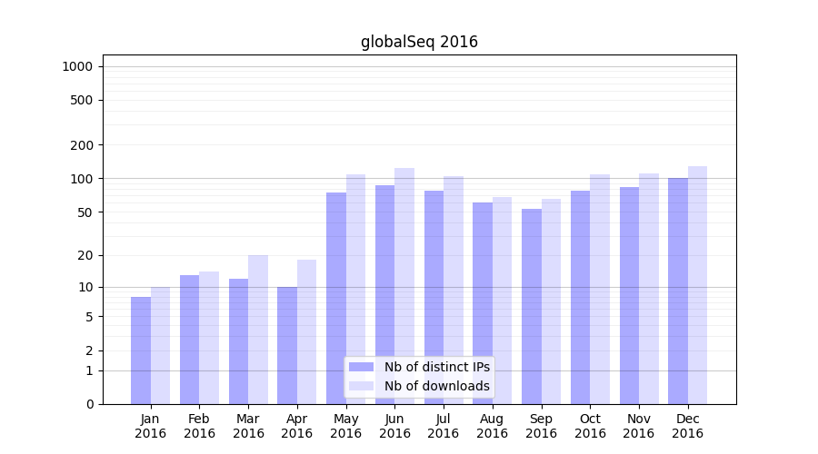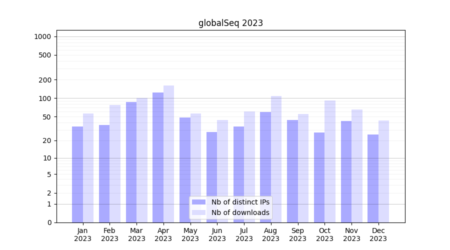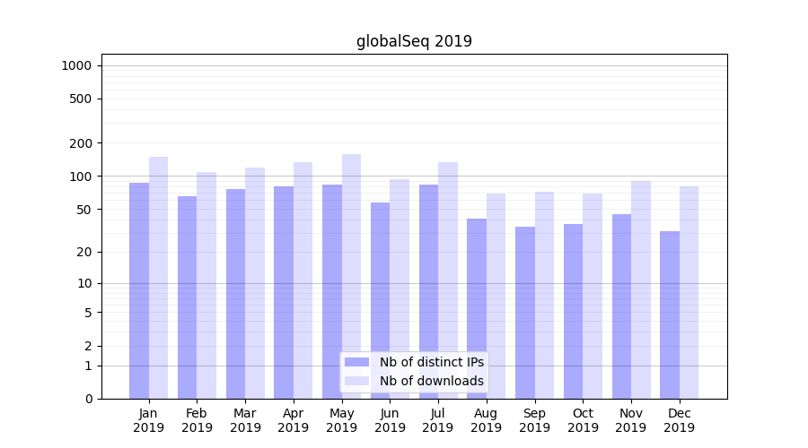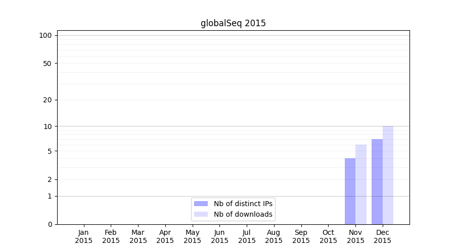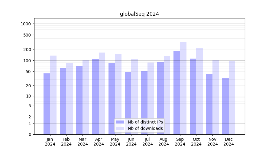 Number of downloads for software package globalSeq, year by year, from 2025 back to 2014 (years with no downloads are omitted):