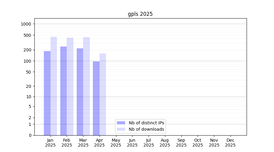 Number of downloads for software package gpls, year by year, from 2025 back to 2014 (years with no downloads are omitted):
