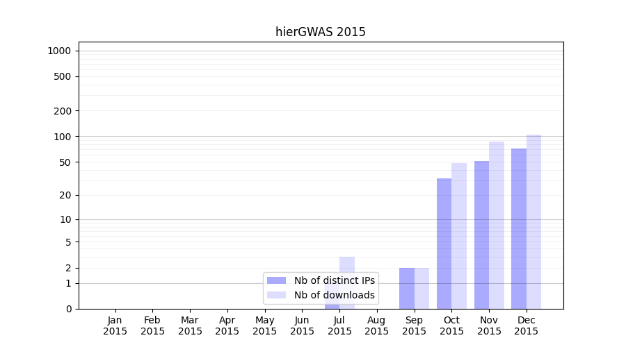 Number of downloads for software package hierGWAS, year by year, from 2025 back to 2014 (years with no downloads are omitted):