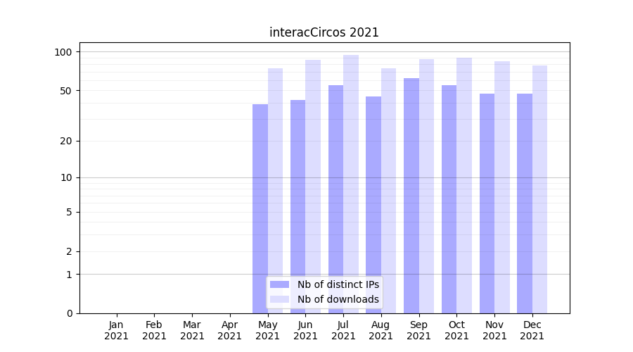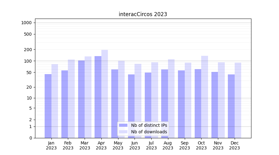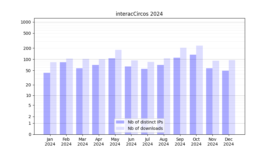 Number of downloads for software package interacCircos, year by year, from 2025 back to 2014 (years with no downloads are omitted):