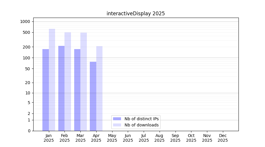 Number of downloads for software package interactiveDisplay, year by year, from 2025 back to 2014 (years with no downloads are omitted):