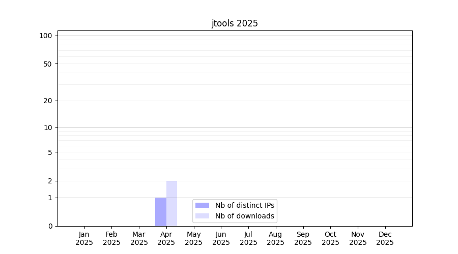 Number of downloads for software package jtools, year by year, from 2025 back to 2014 (years with no downloads are omitted):