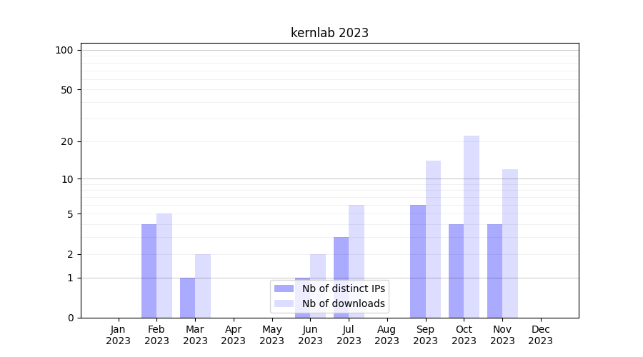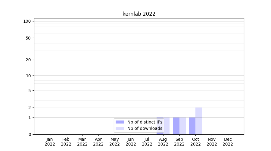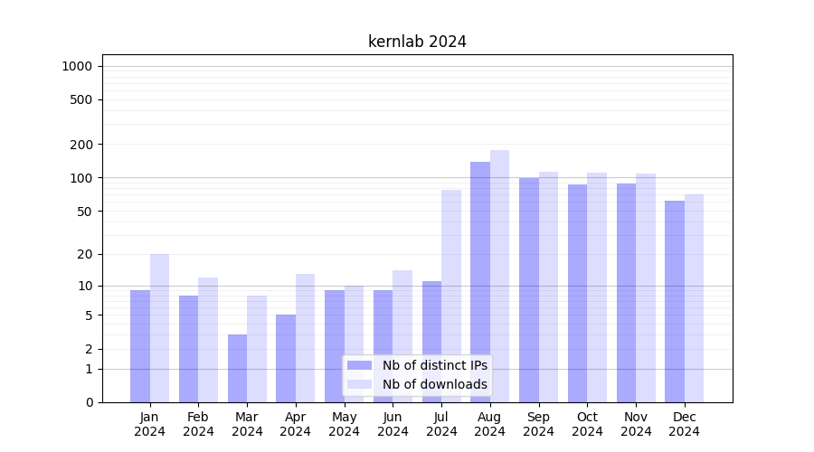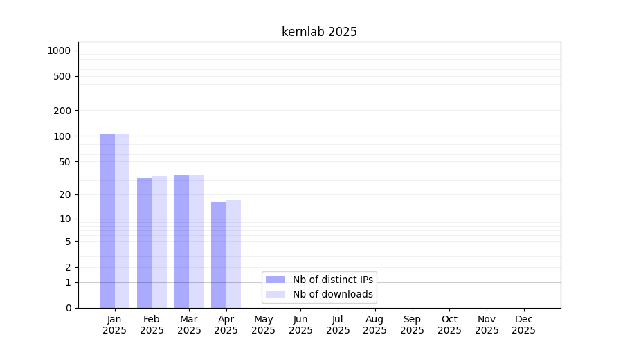 Number of downloads for software package kernlab, year by year, from 2025 back to 2014 (years with no downloads are omitted):