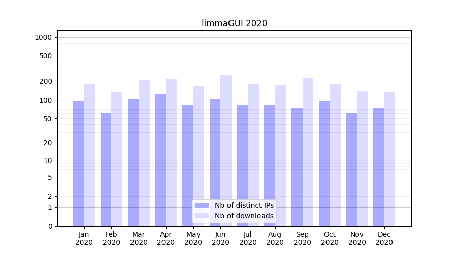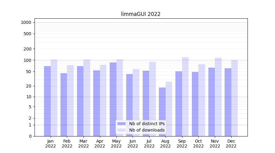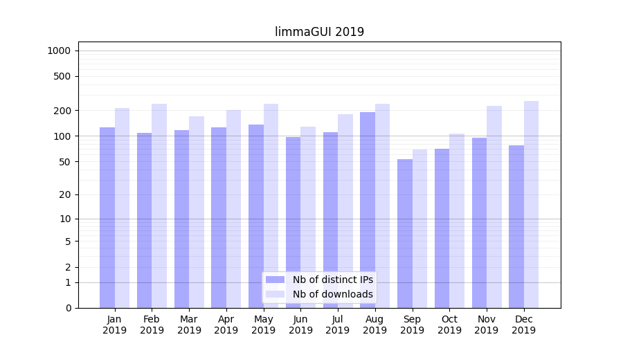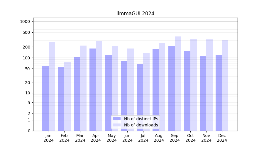 Number of downloads for software package limmaGUI, year by year, from 2025 back to 2014 (years with no downloads are omitted):