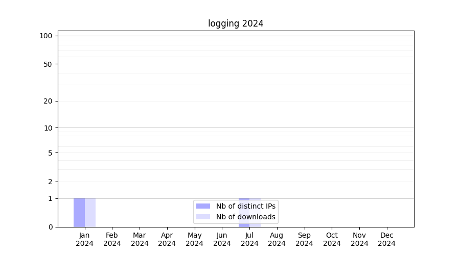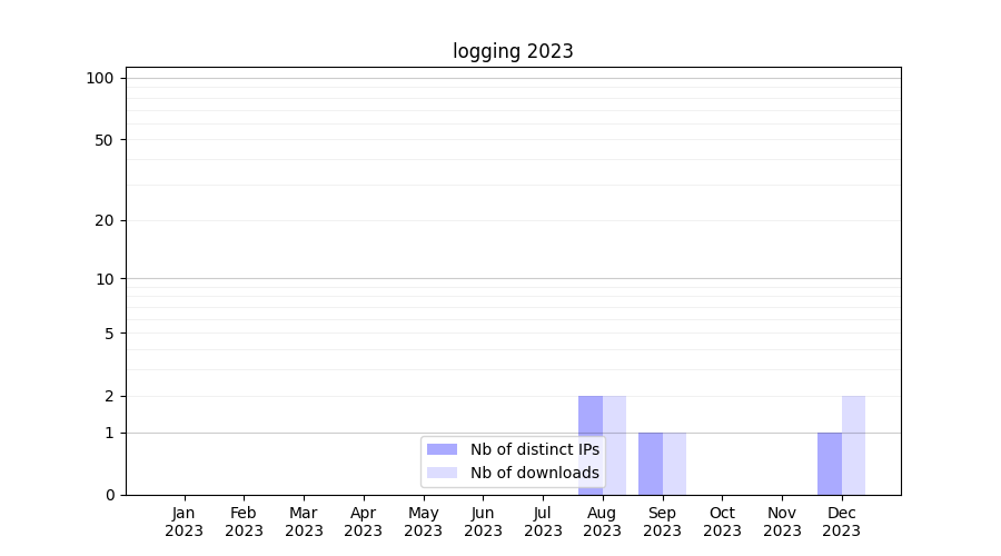 Number of downloads for software package logging, year by year, from 2025 back to 2014 (years with no downloads are omitted):