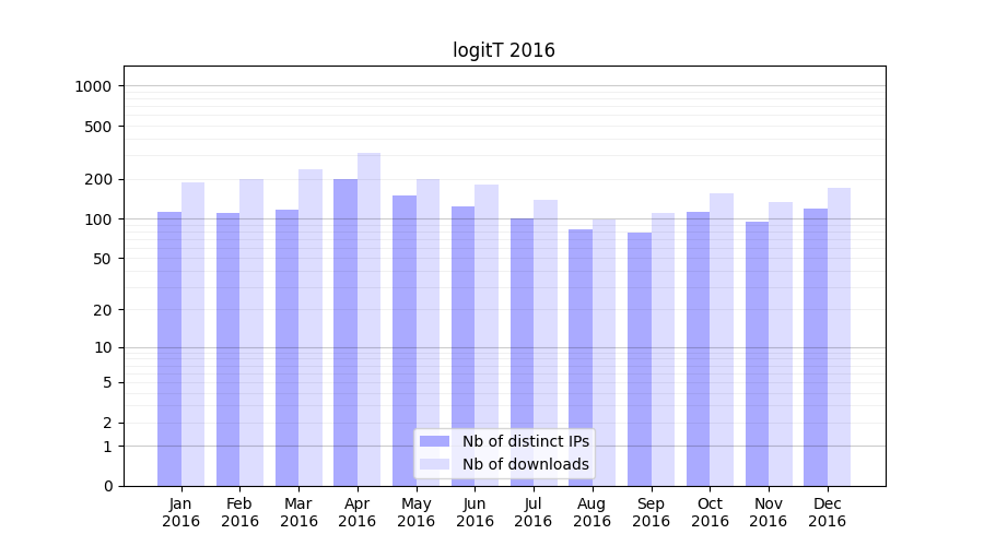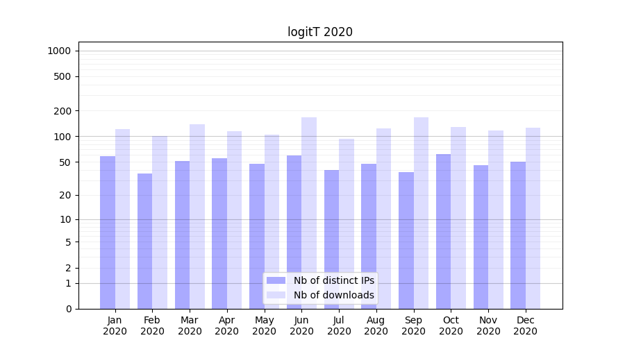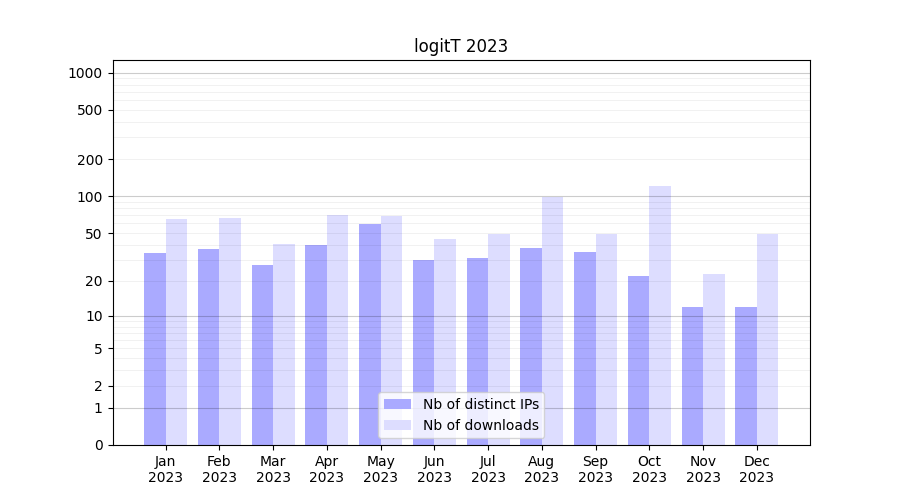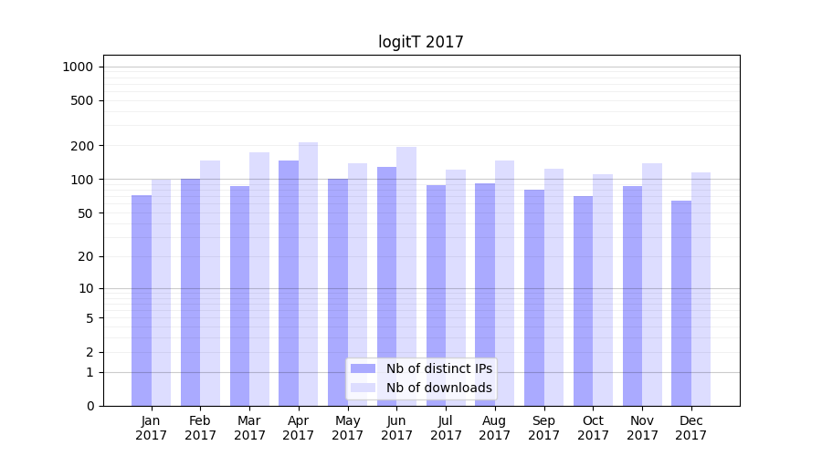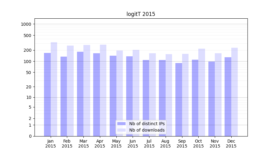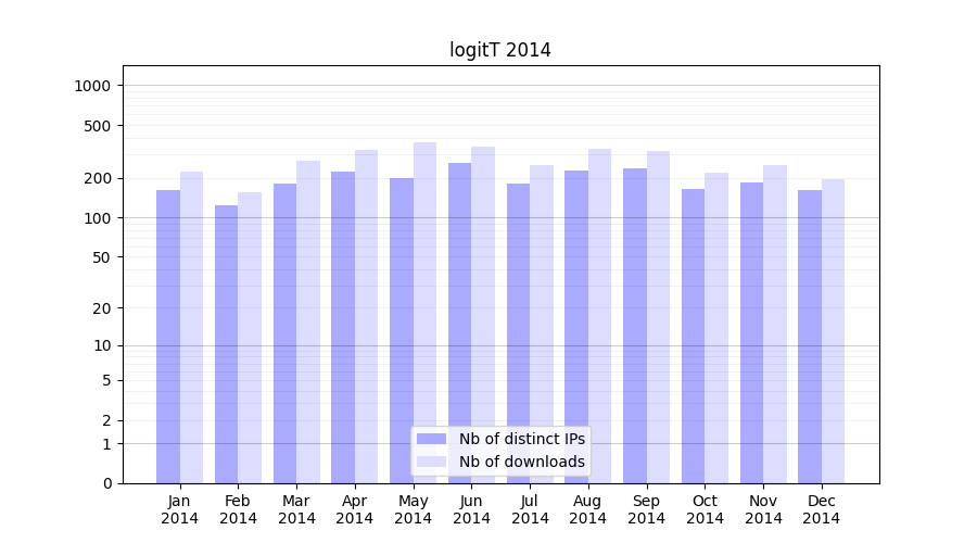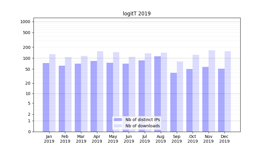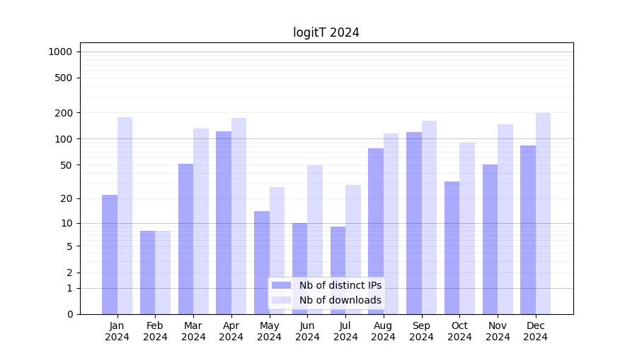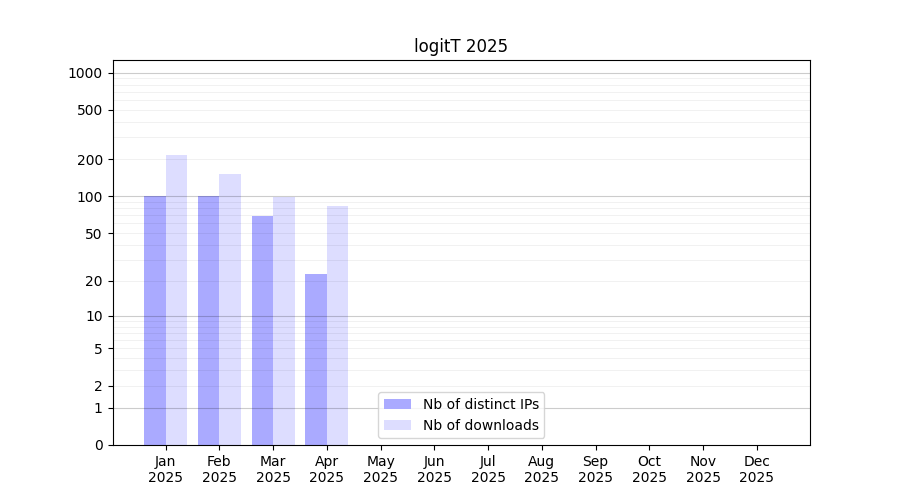 Number of downloads for software package logitT, year by year, from 2025 back to 2014 (years with no downloads are omitted):
