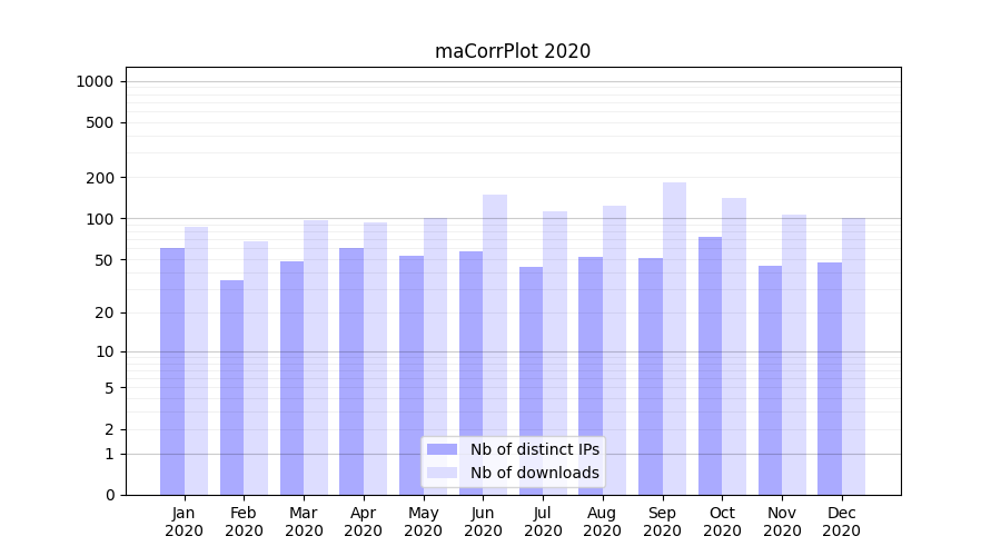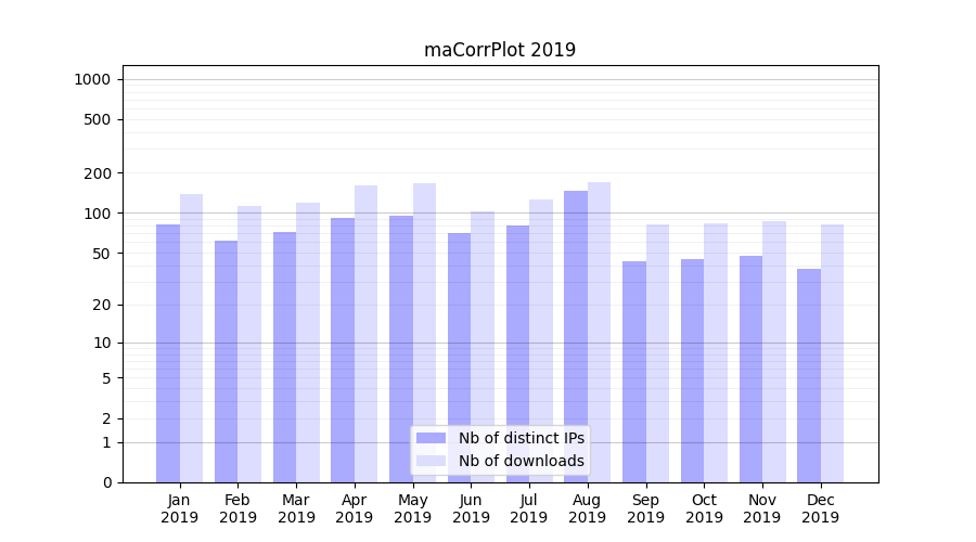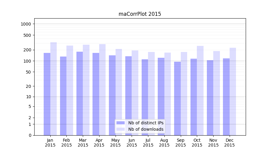Number of downloads for software package maCorrPlot, year by year, from 2025 back to 2014 (years with no downloads are omitted):