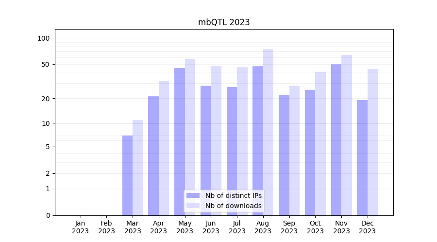 Number of downloads for software package mbQTL, year by year, from 2025 back to 2014 (years with no downloads are omitted):