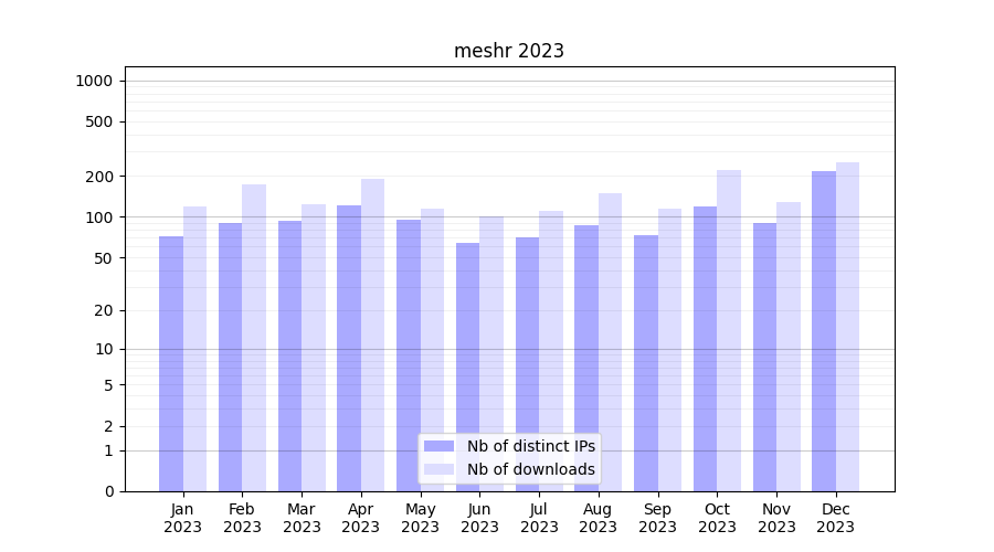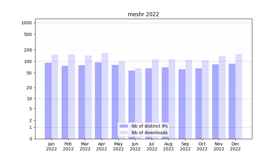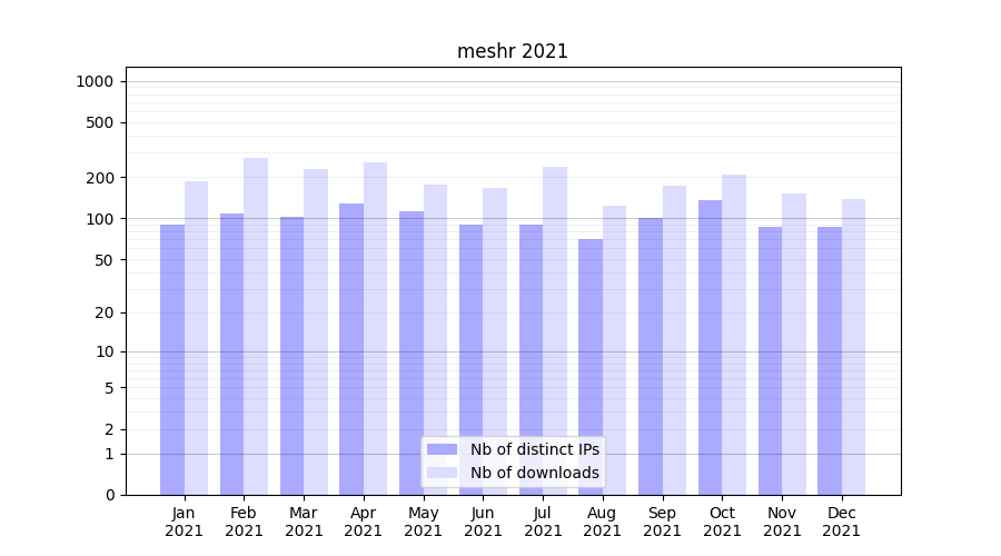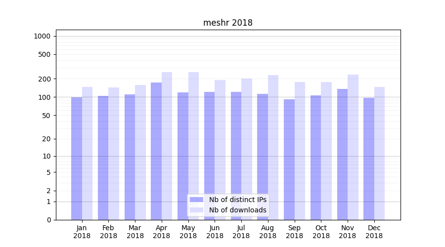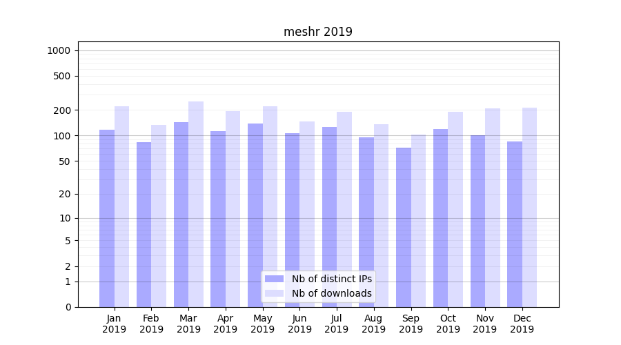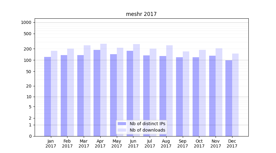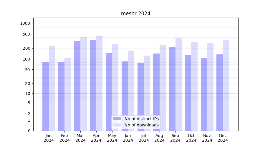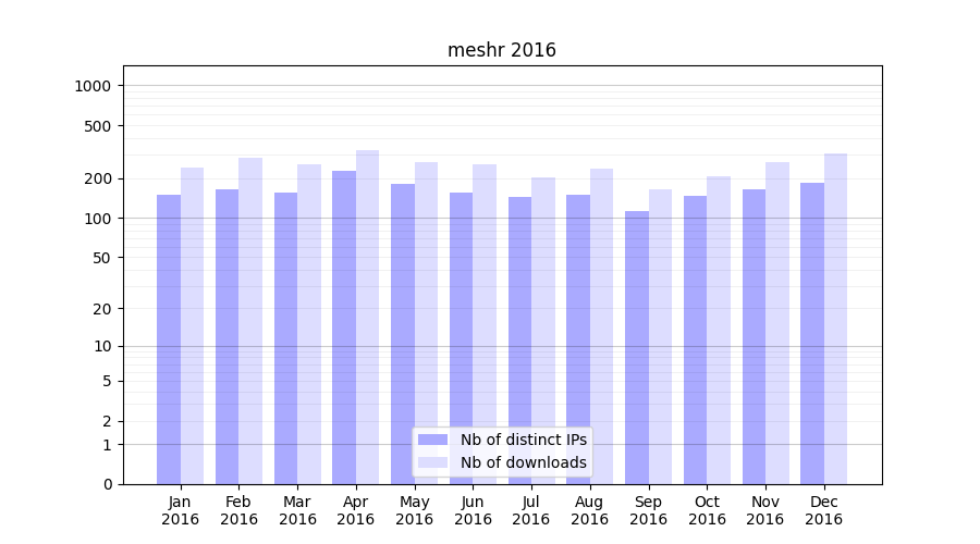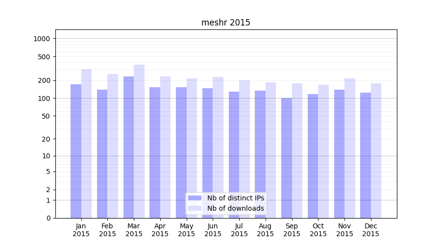 Number of downloads for software package meshr, year by year, from 2025 back to 2014 (years with no downloads are omitted):