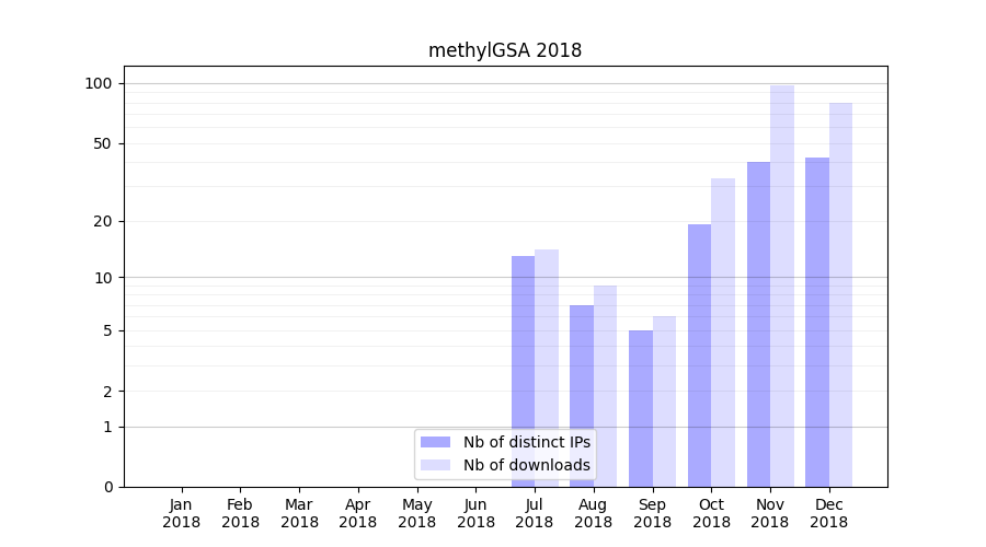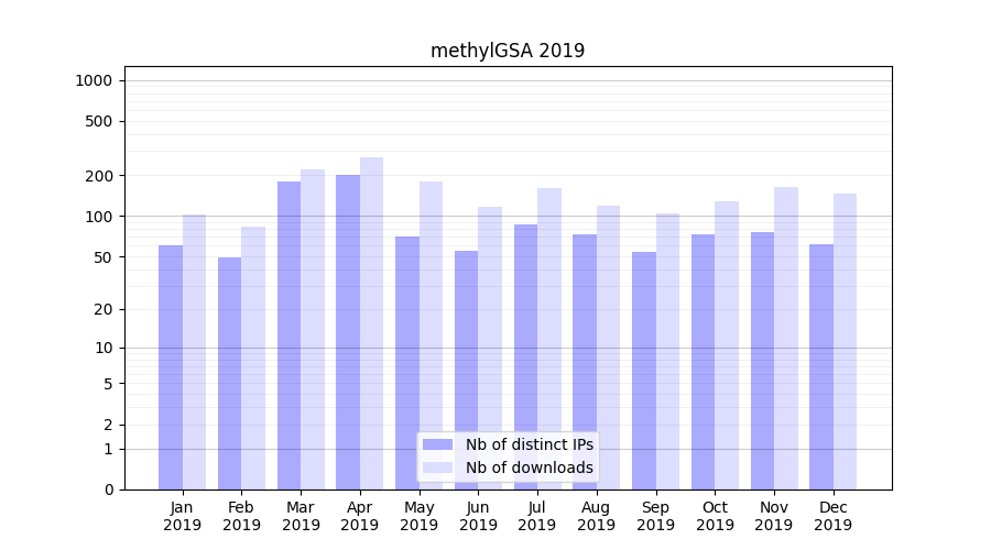 Number of downloads for software package methylGSA, year by year, from 2025 back to 2014 (years with no downloads are omitted):