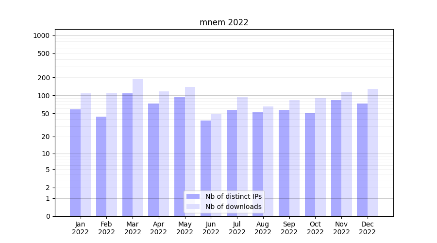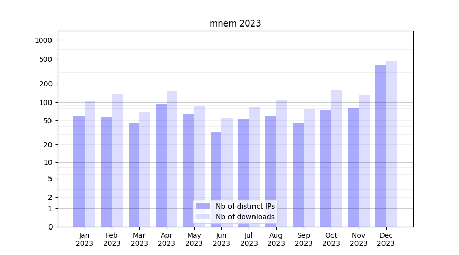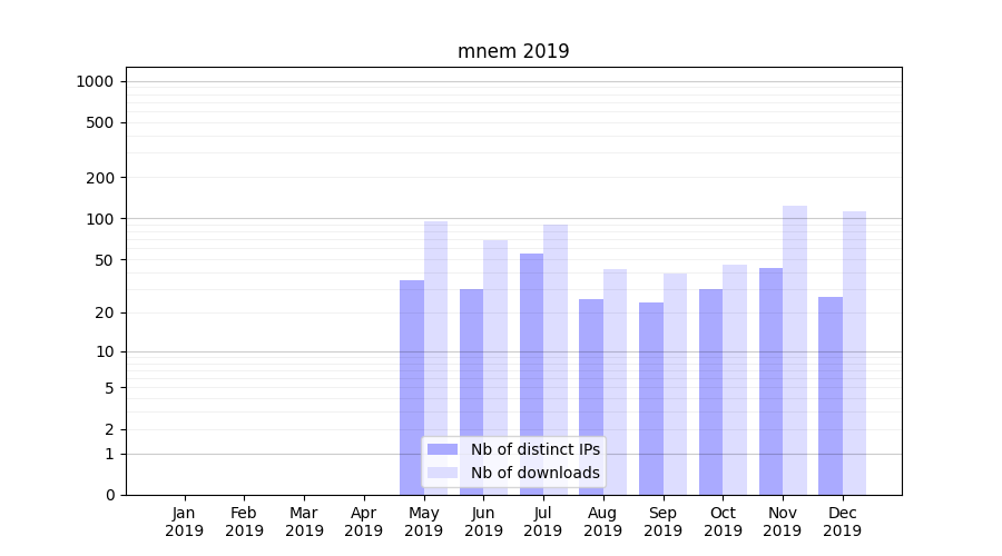 Number of downloads for software package mnem, year by year, from 2025 back to 2014 (years with no downloads are omitted):