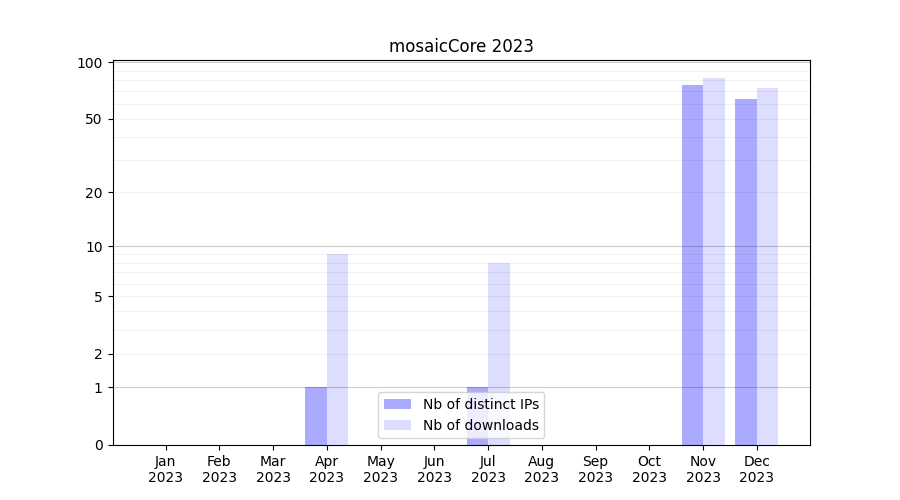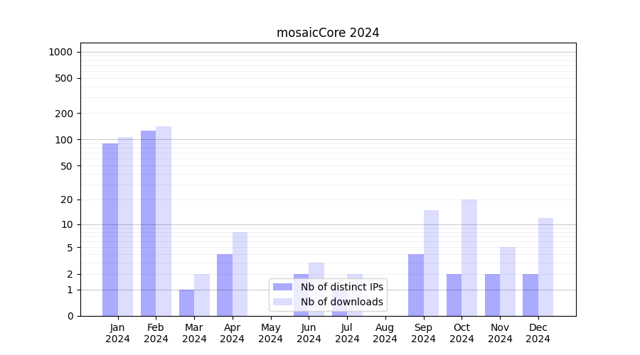 Number of downloads for software package mosaicCore, year by year, from 2025 back to 2014 (years with no downloads are omitted):