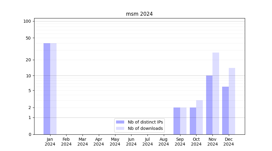 Number of downloads for software package msm, year by year, from 2025 back to 2014 (years with no downloads are omitted):