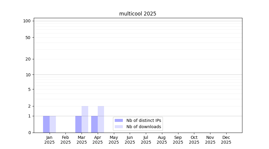 Number of downloads for software package multicool, year by year, from 2025 back to 2014 (years with no downloads are omitted):