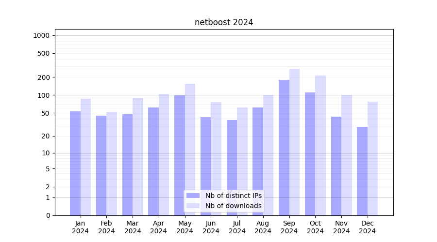 Number of downloads for software package netboost, year by year, from 2025 back to 2014 (years with no downloads are omitted):