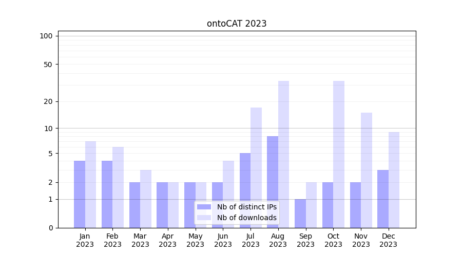 Number of downloads for software package ontoCAT, year by year, from 2025 back to 2014 (years with no downloads are omitted):