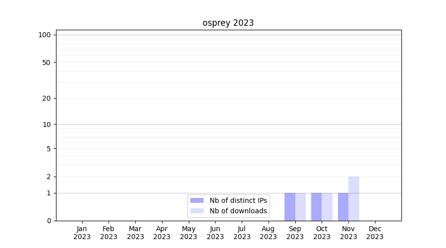 Number of downloads for software package osprey, year by year, from 2025 back to 2014 (years with no downloads are omitted):